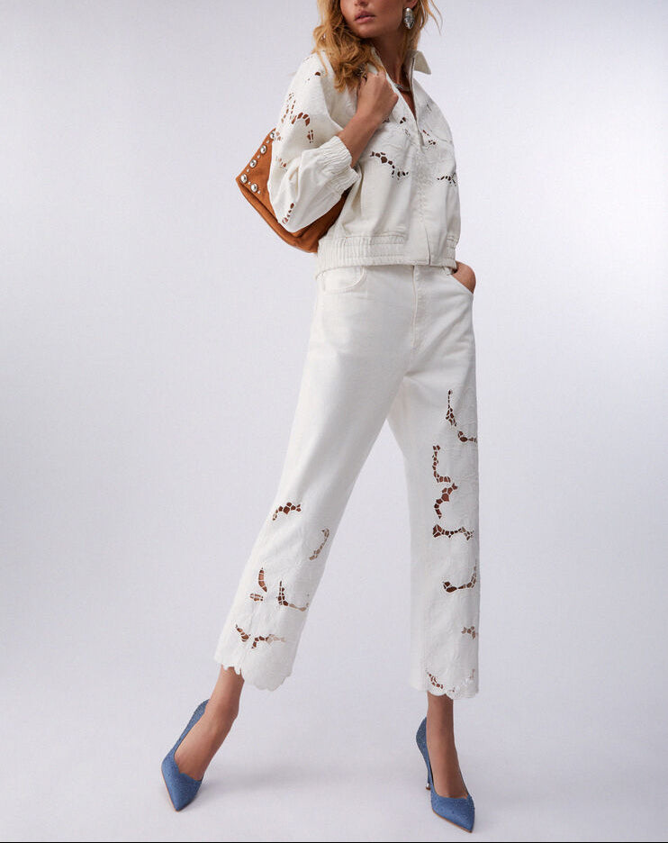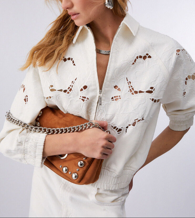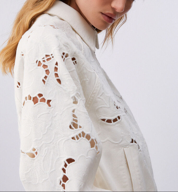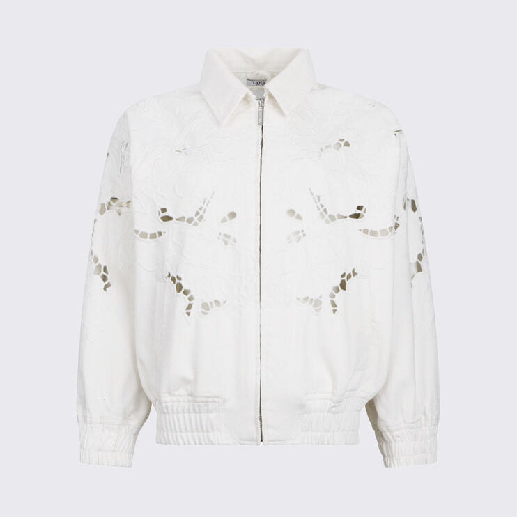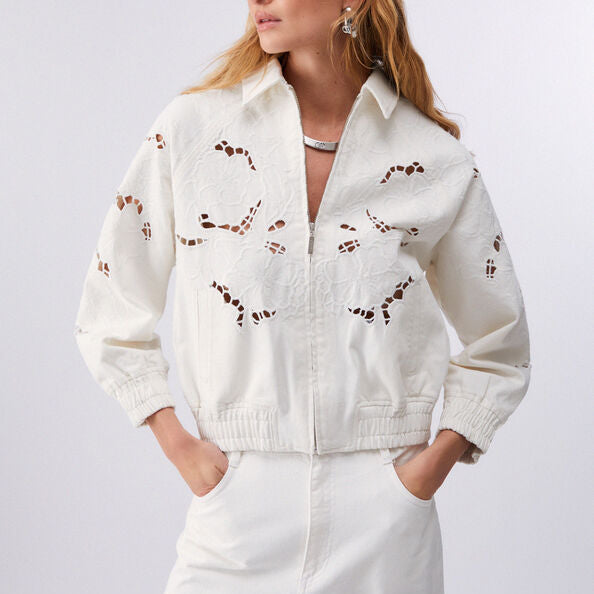 Bomber 100% algodão | Bordado vazado | Bolsos práticos | Fecho de zíper | Punhos e barra elásticos