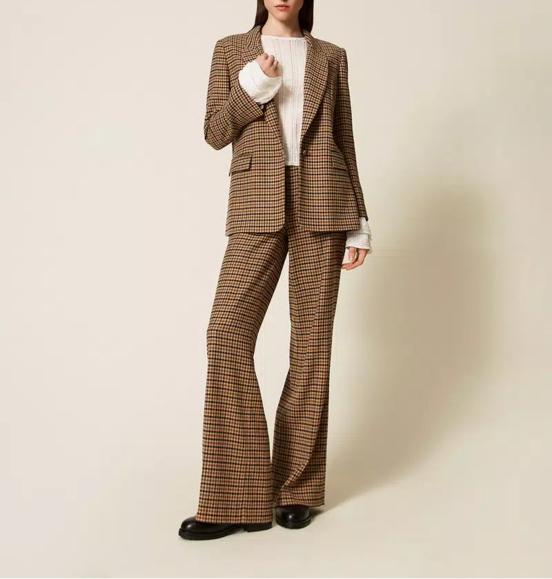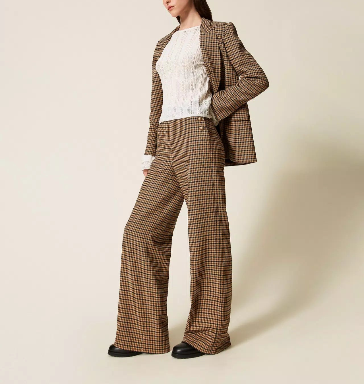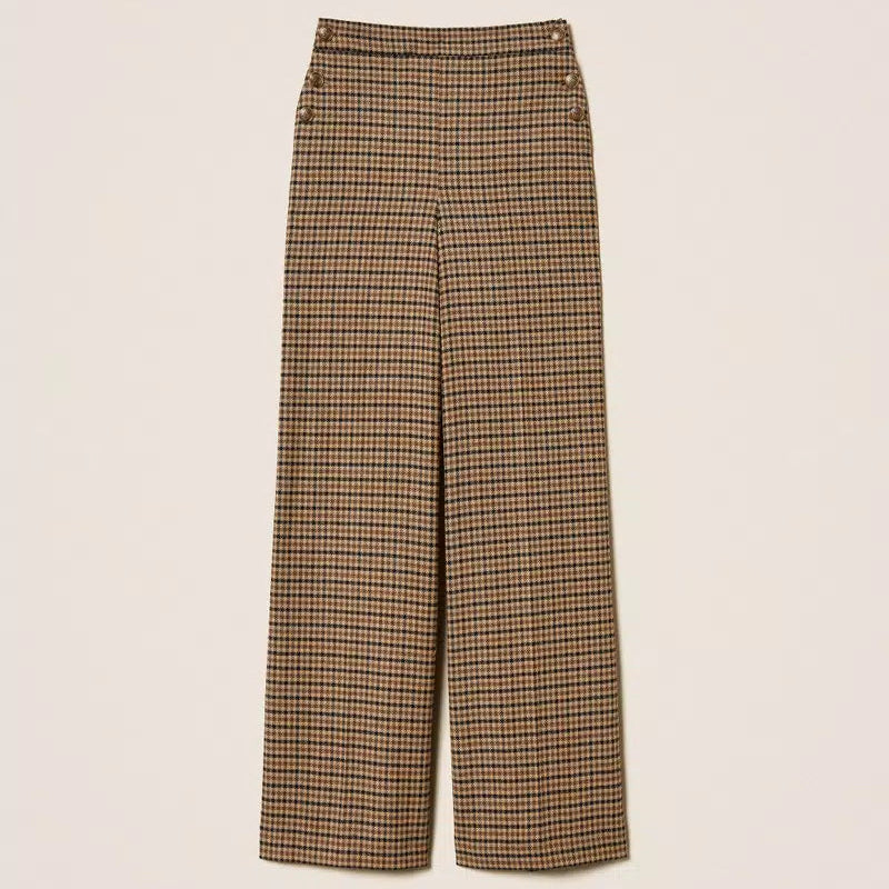Calça 39% lã 30% poliéster 30% viscose 1% | Calças de sarja em mistura de lã com padrão xadrez e botões dourados de meia bola. Com bolsos enviesados, vinco passado a ferro, placa com o logotipo Oval T nas costas, corte reto.