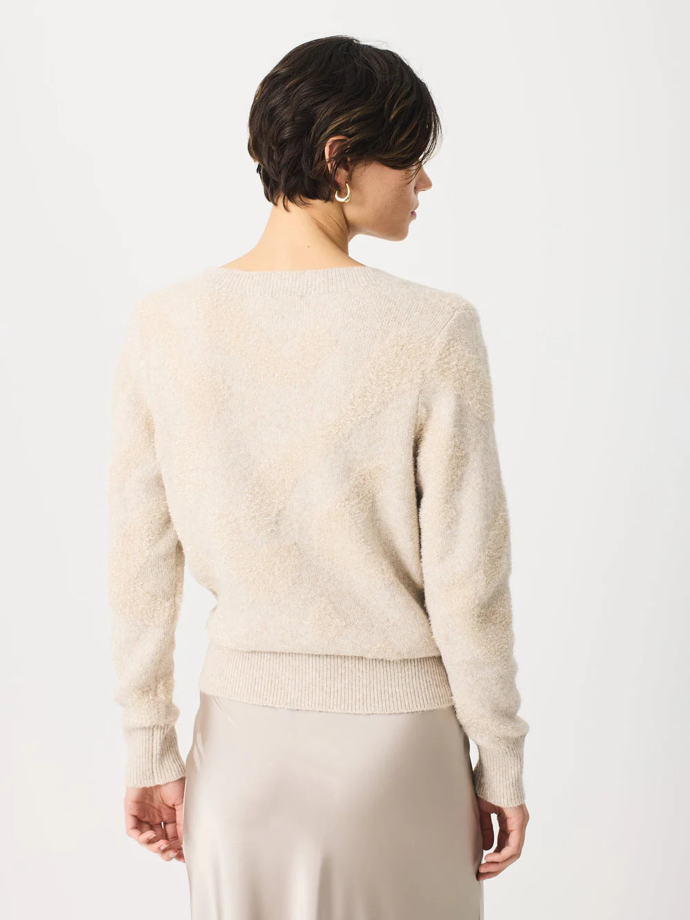Malha 53% poliamida 34% poliéster 10% fibras metálicas 3% lã | Casaco de malha confecionado em material texturizado, macio e fofo, com acabamentos levemente brilhantes que lhe conferem um visual sofisticado e delicado. Sua malha de dois fios, tom sobre tom, realça diferentes texturas de formas.