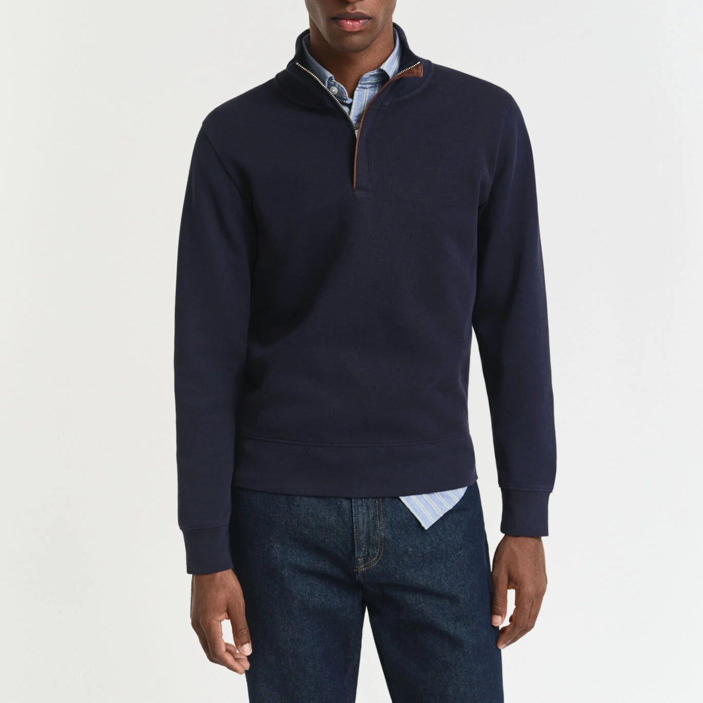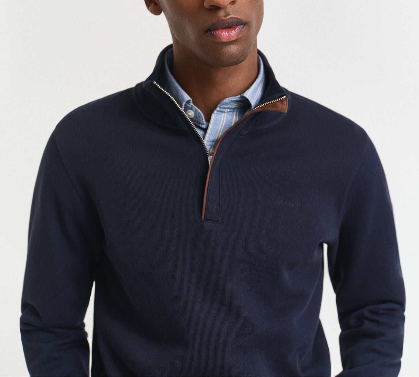 Camisola100% algodão | Mais elegante do que uma sweatshirt, mas igualmente confortável, esta peça é perfeita para usar em camadas por cima de camisas no escritório ou de t-shirts ao fim de semana. Concebida em 100% algodão com um toque suave, tem um corte normal e colarinho com meio fecho. Os seus detalhes incluem apontamentos em imitação de camurça, um fecho de correr em metal prateado e um logótipo GANT no mesmo tom bordado no peito.