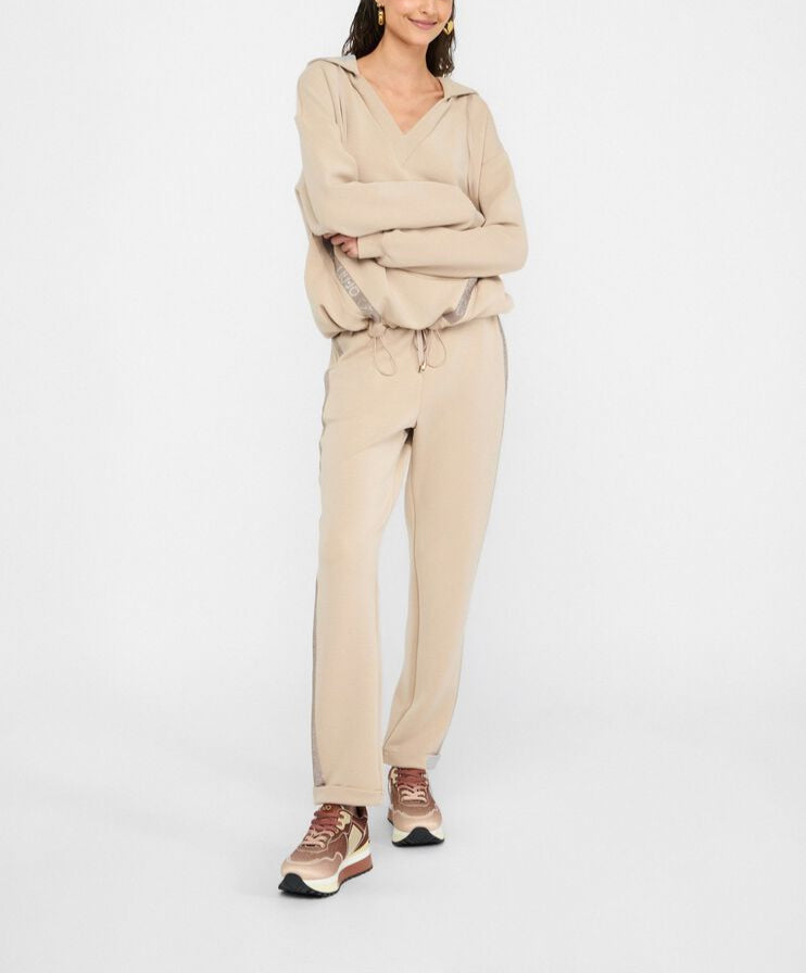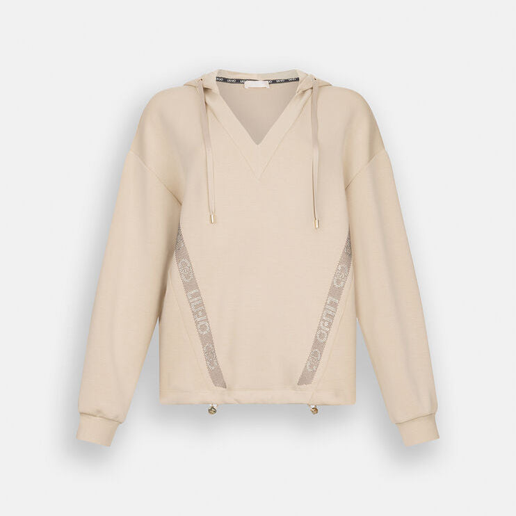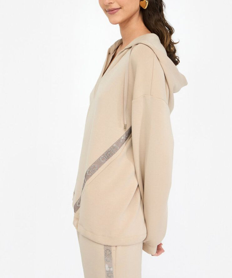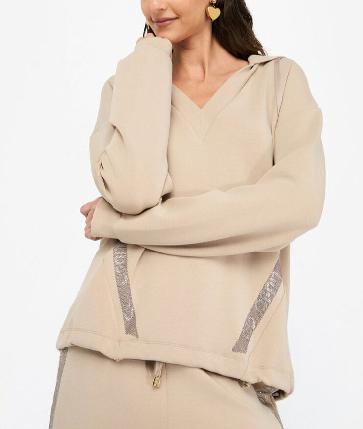 Malha 48% modal 48% poliéster 4% elastano | Moletom bege | Feito de material elástico Scuba | Capuz com cordão \ Gola em V \ Logotipo com mini tachas | Elástico com cordão na bainha