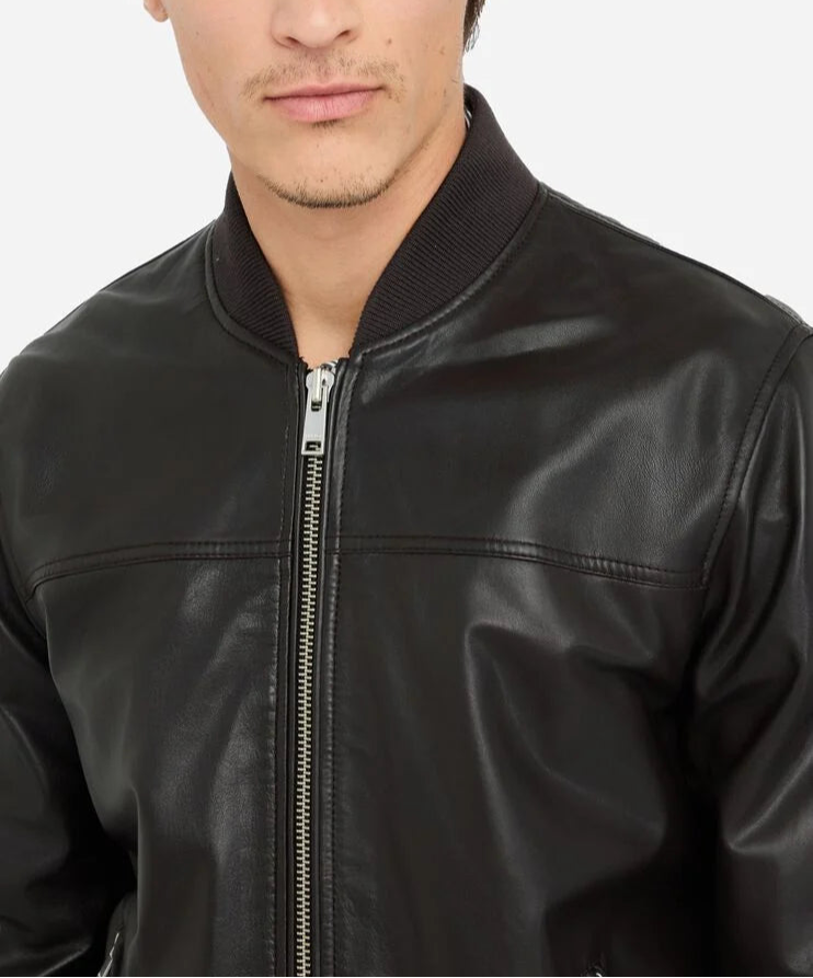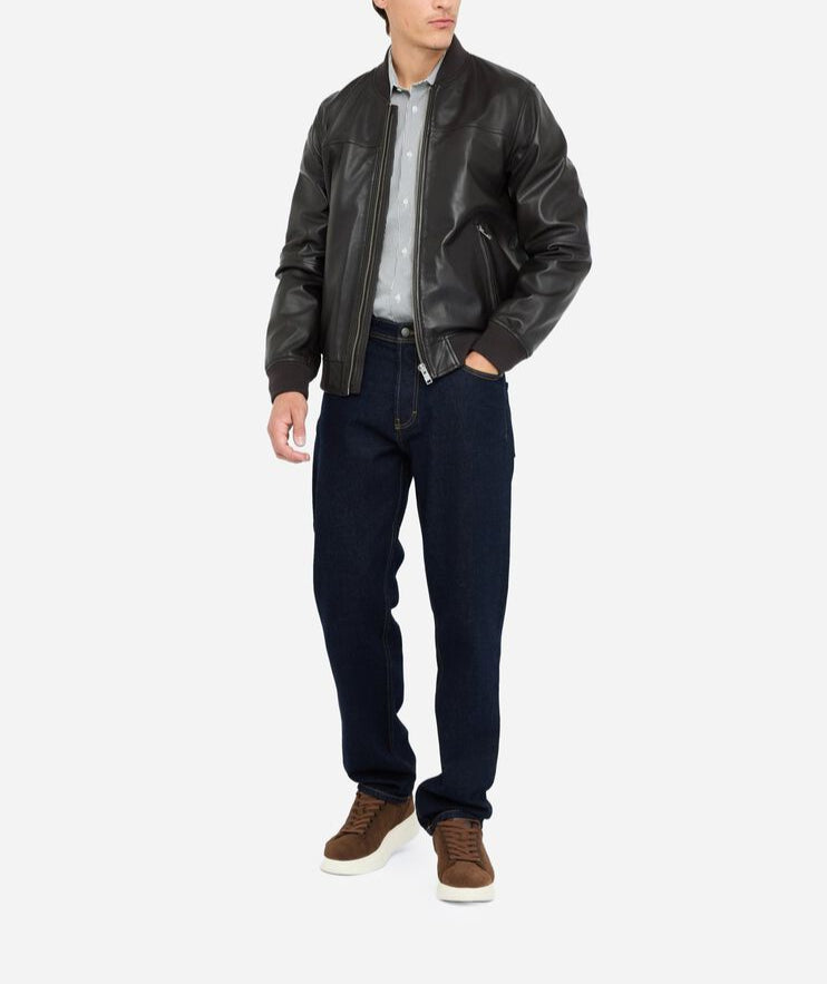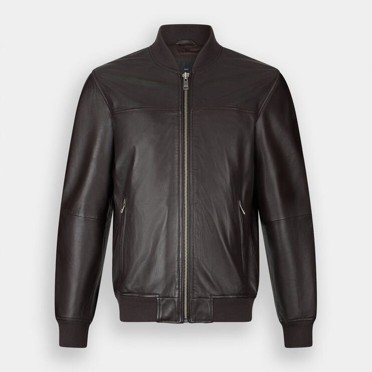 Blusão 100% pele | Jaqueta bomber de couro | Decote, punhos e bainha em malha canelada Bolsos com zíper Fecho de zíper