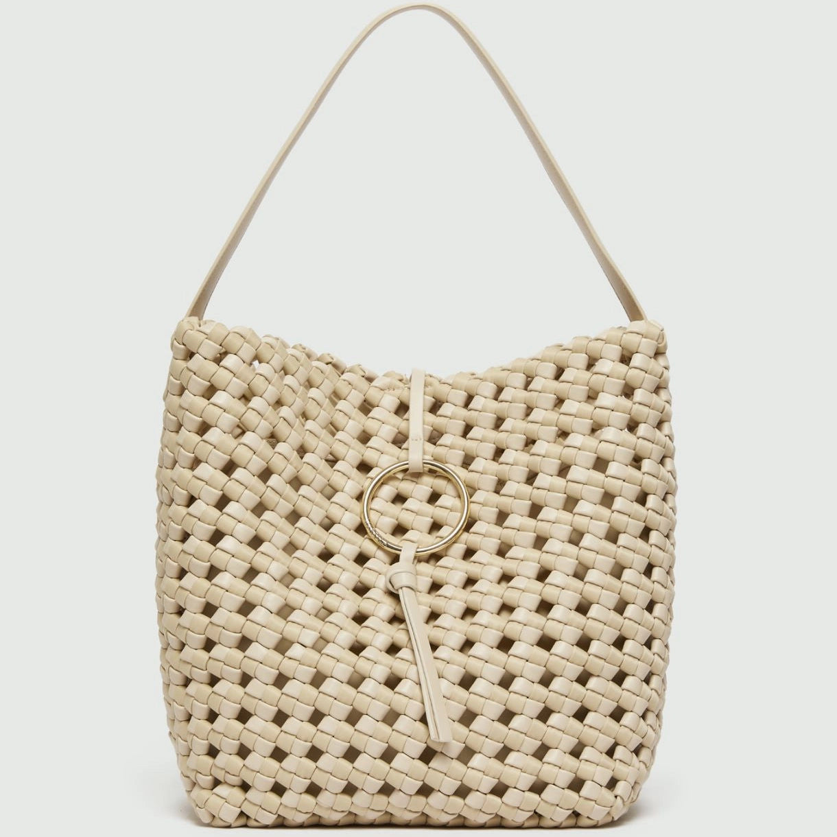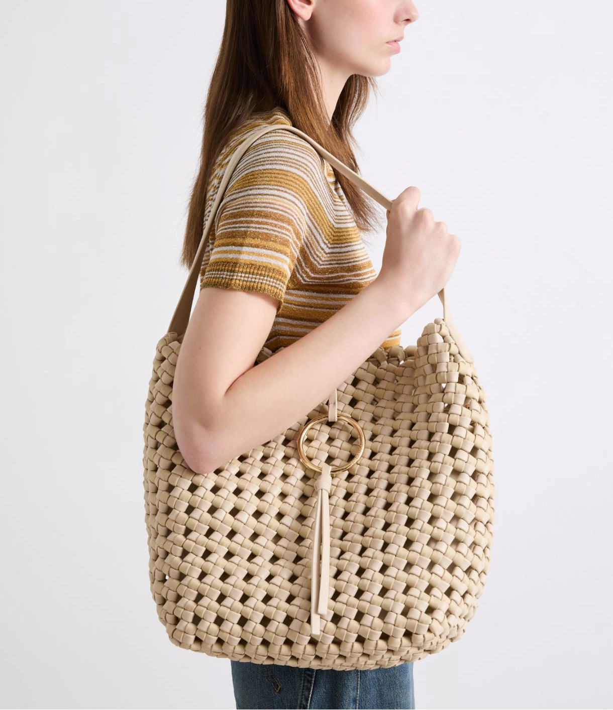 Carteira 100% poliéster | As laterais trançadas conferem um toque refinado e veranil a esta bolsa espaçosa. Pode ser usada no ombro e acomoda todos os seus pertences com praticidade, graças ao bolso interno com zíper. Bolsa saco grande em tecido revestido e nylon trançado | Bolso interno de nylon com zíper \ Fecho magnético Personalizada com um laço e argola banhada a ouro claro com gravação do logotipo \ Modelo sem forro | Acessórios em metal com acabamento em ouro claro Tamanho: 26 x 18 x 32 cm
