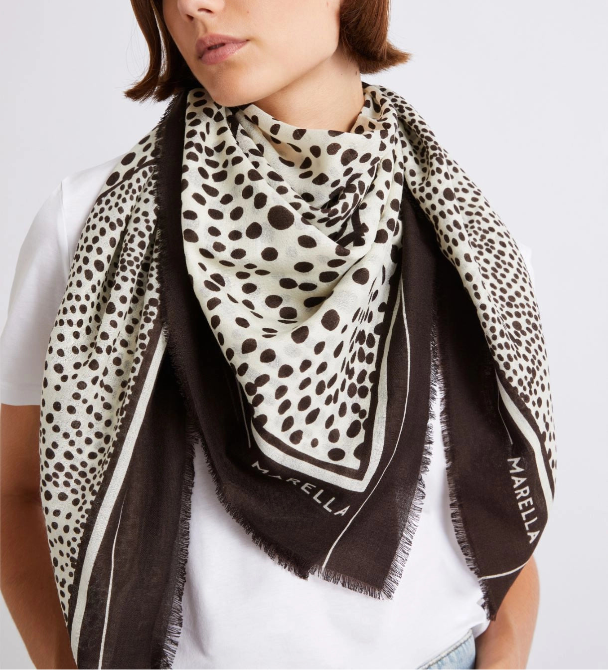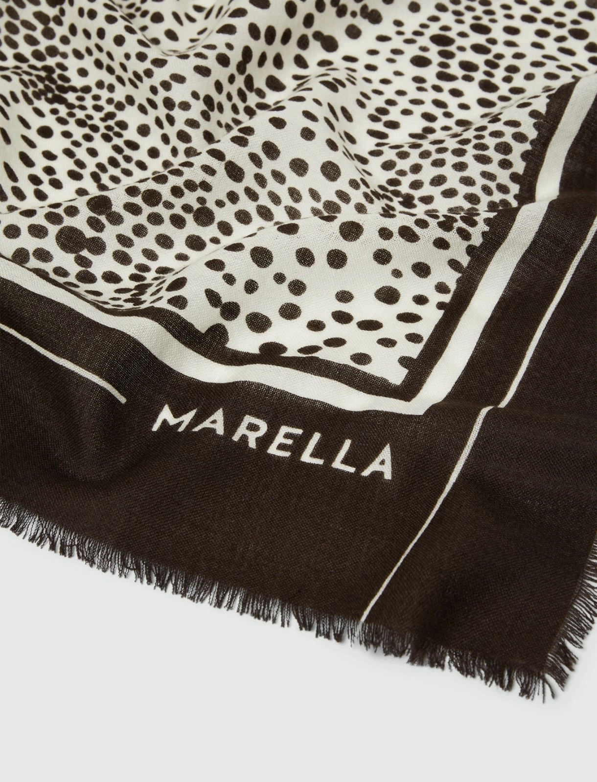 Lenço 100% lã | Este xale amplo e versátil em lã leve apresenta uma nova estampa animal com um toque urbano. Use-o sobre uma camiseta para looks mais informais ou sobre um blazer e camisa para o ambiente de trabalho. Xale de lã com estampa animal | Logotipo Marella em cor contrastante | Detalhes com franjas | Tamanho: 112 x 112 cm