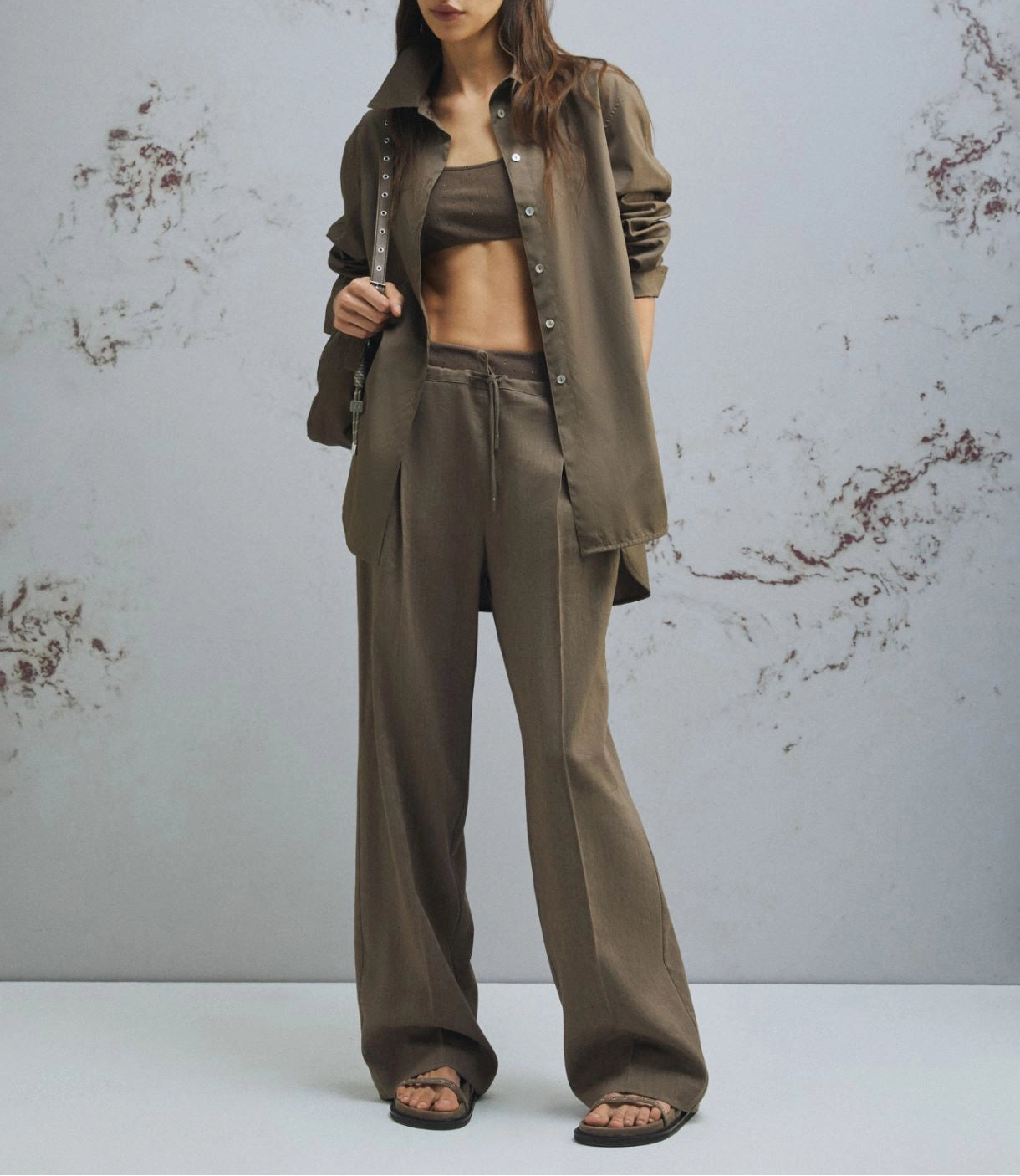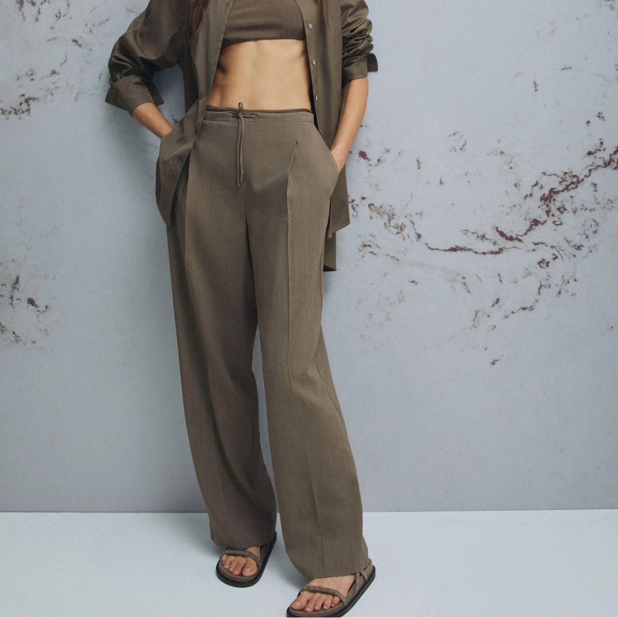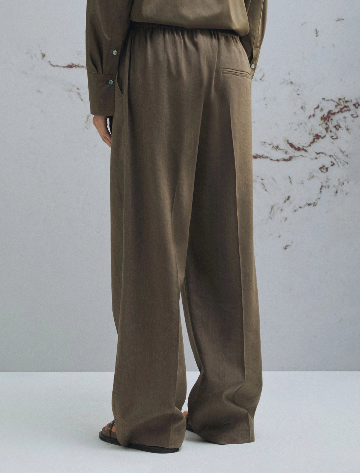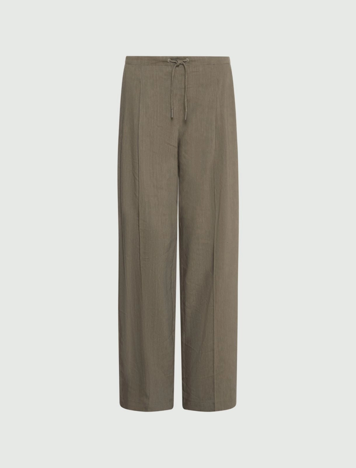 Calça 50% viscose 48% linho 2% elastano | Estas calças em linho e viscose com elastano macio personificam o estilo casual. Perfeitas para o escritório, dias de folga e passeios de verão que pedem sandálias. O tecido principal contém matérias-primas derivadas da celulose da madeira; uma fibra obtida de forma sustentável em relação aos recursos florestais. Calças em linho e viscose com elastano | Corte regular \ Cós elástico na parte de trás com cordão na frente | Detalhe de pregas vincadas na frente e atrás | Bolsos laterais inclinados e um bolso traseiro embutido