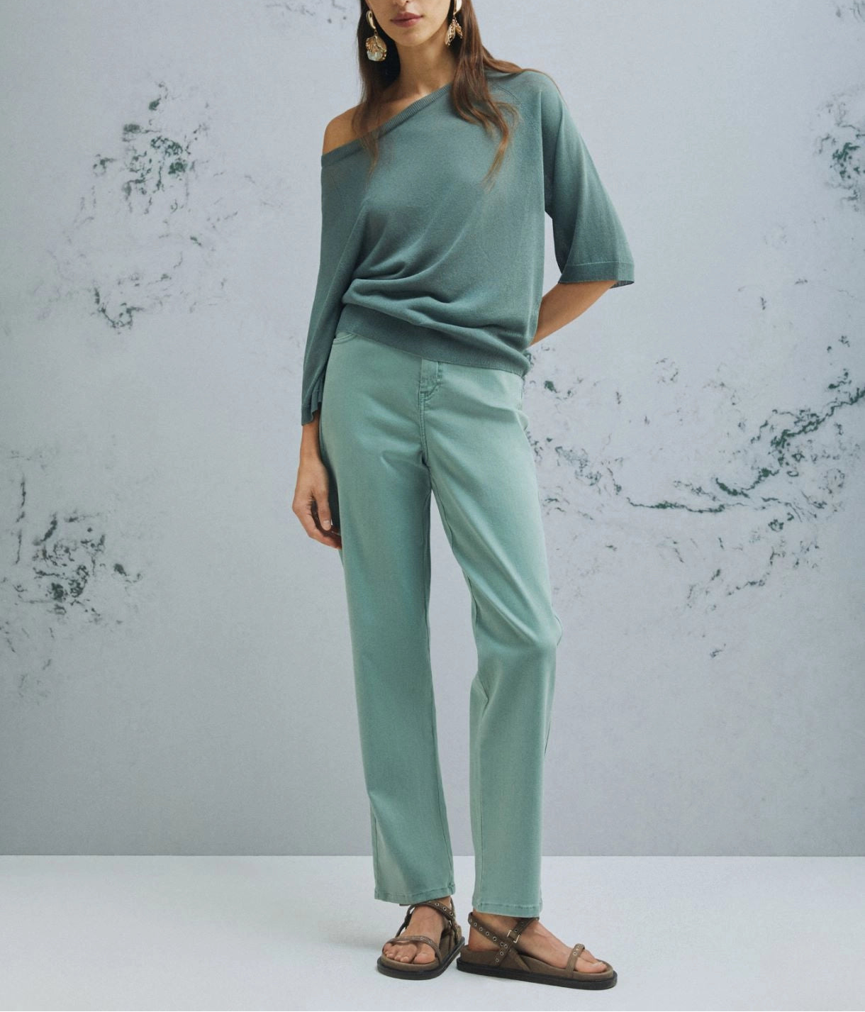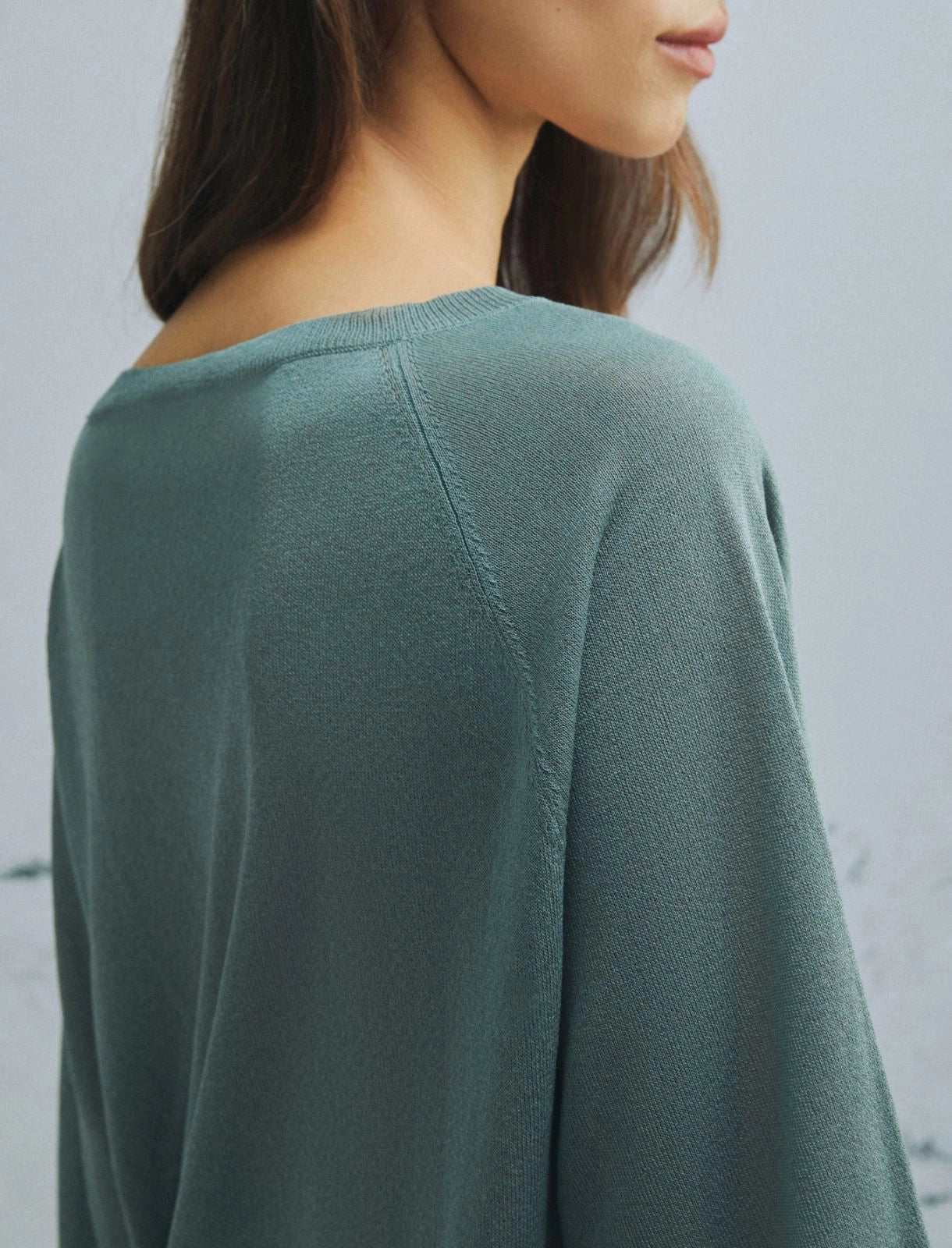 Malha 85% viscose 15% poliéster \ Este suéter de viscose com efeito tule exala um novo charme metropolitano. O modelo, que valoriza a silhueta e possui leve transparência, apresenta decote canoa e mangas 3/4 para proporções refinadas. O tecido principal contém matéria-prima derivada da celulose da madeira; uma fibra obtida de forma sustentável em relação aos recursos florestais. Suéter em fio de viscose com efeito tule \ Corte regular | Decote canoa e ombros raglan Mangas 3/4 | Acabamento em ribana fina e detalhe de logo bordado na barra
