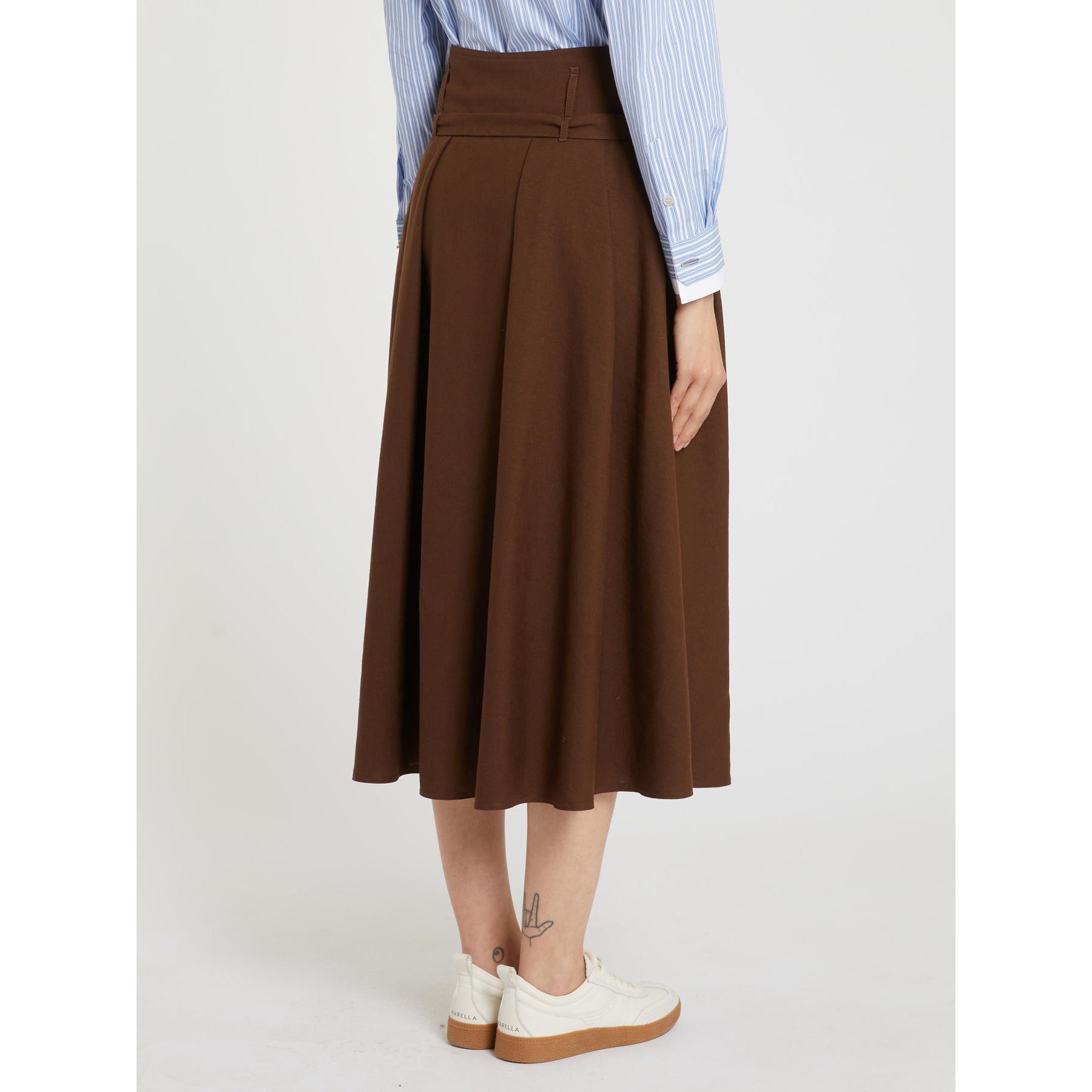 Saia 97% algodão 3% elastano \ Saia em mistura de linho - Corte evasê - Passadores de cinto na cintura e fecho lateral invisível com zíper - Bolsos laterais embutidos - Cinto de tecido