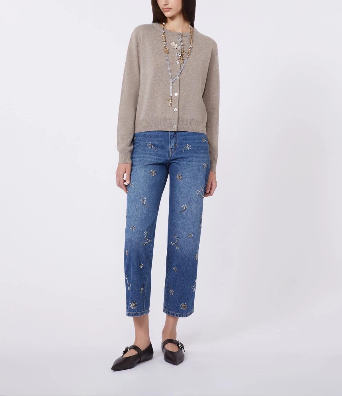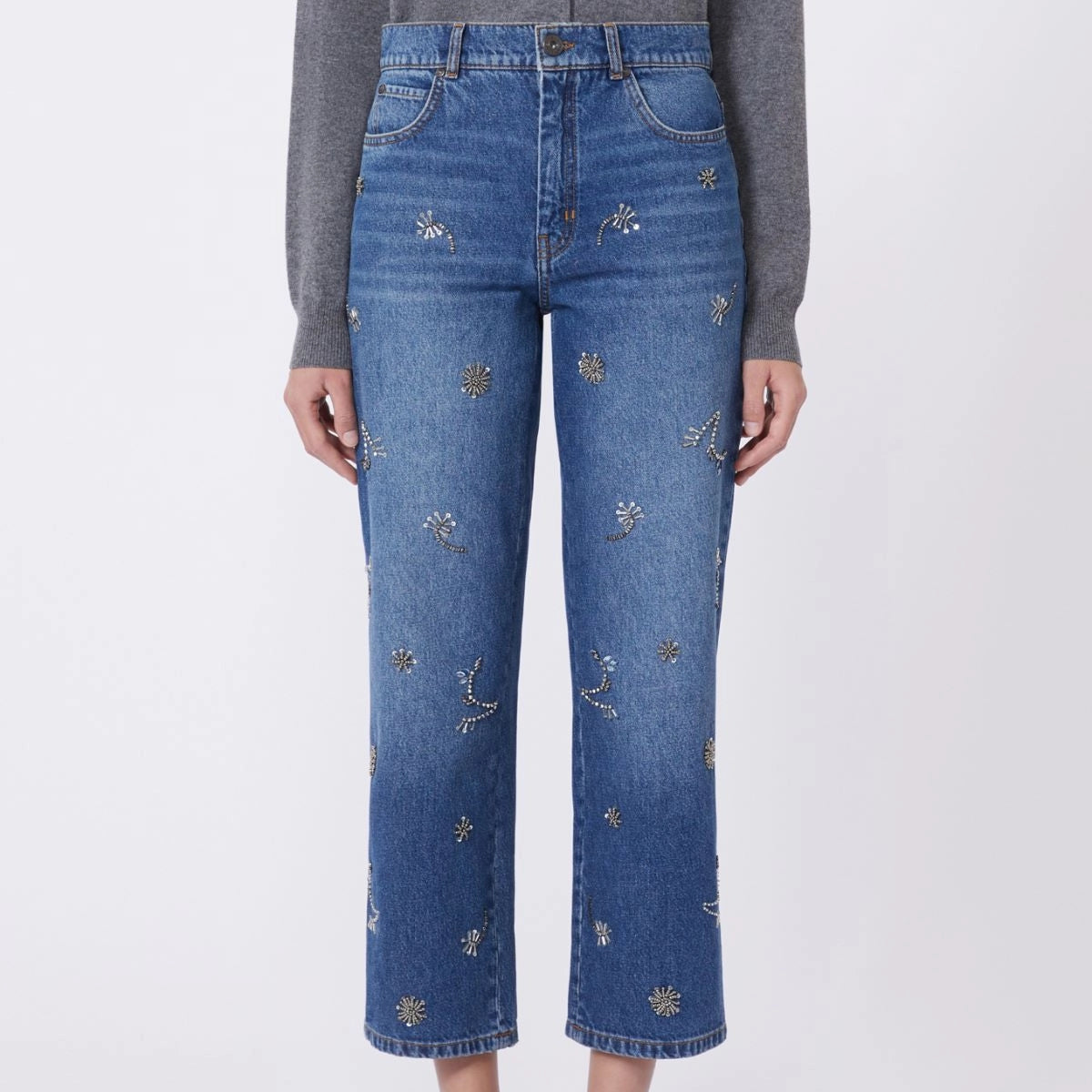 Calça 100% algodão | Calça jeans de 5 bolsos com detalhe bordado na frente. Tecido principal em fibras de algodão, cultivadas e processadas segundo sistemas de agricultura orgânica. Calça jeans em denim 100% algodão. Corte reto. Fecho com zíper e botão de pressão metálico. Rebites metálicos e passadores de cinto na cintura. Etiqueta com logo de borboleta no bolso traseiro. Etiqueta com logo na parte de trás da cintura.