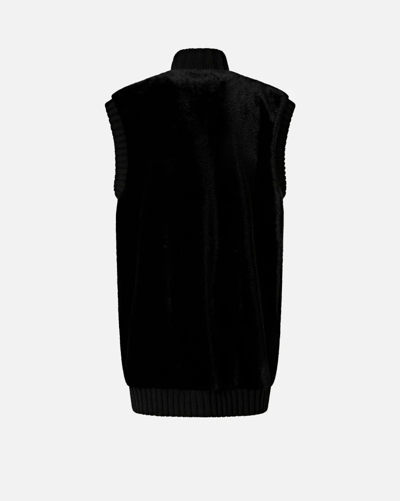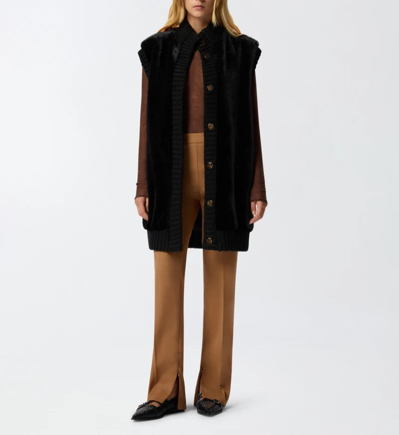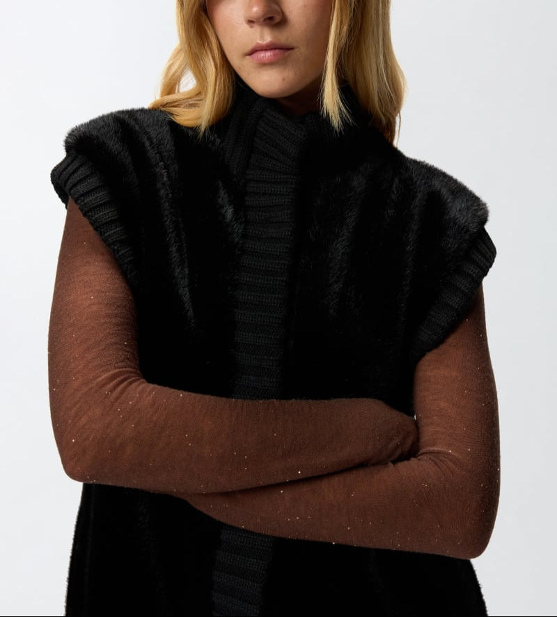 Colete 100% poliéster | Colete longo de corte reto com detalhes em malha canelada na gola alta, fecho frontal oculto e cavas. Esta peça é confecionada em tecido Aspen macio com efeito de pelo, particularmente agradável ao toque. Este agasalho é ideal para usar ao ar livre nos dias mais frios do início da estação, com o máximo conforto, sem abrir mão do estilo.