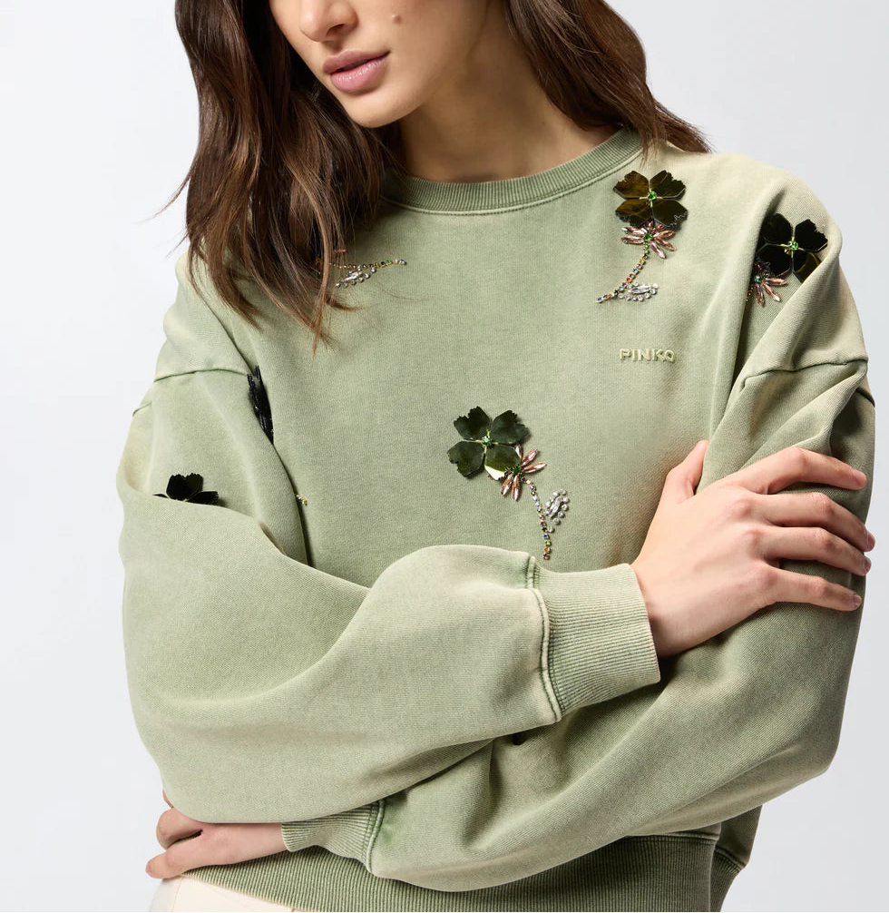 Malha 100% algodão | Blusa cropped de algodão puro com barra, punhos e gola redonda canelados. O modelo, com mangas compridas e ombros caídos, apresenta um leve efeito desbotado nas áreas de maior desgaste e é adornado com delicadas flores de joia na parte frontal, compostas por cristais brilhantes e pétalas espelhadas. Uma expressão do estilo criativo atemporal da PINKO, esta blusa é ideal para looks modernos que combinam funcionalidade e glamour.