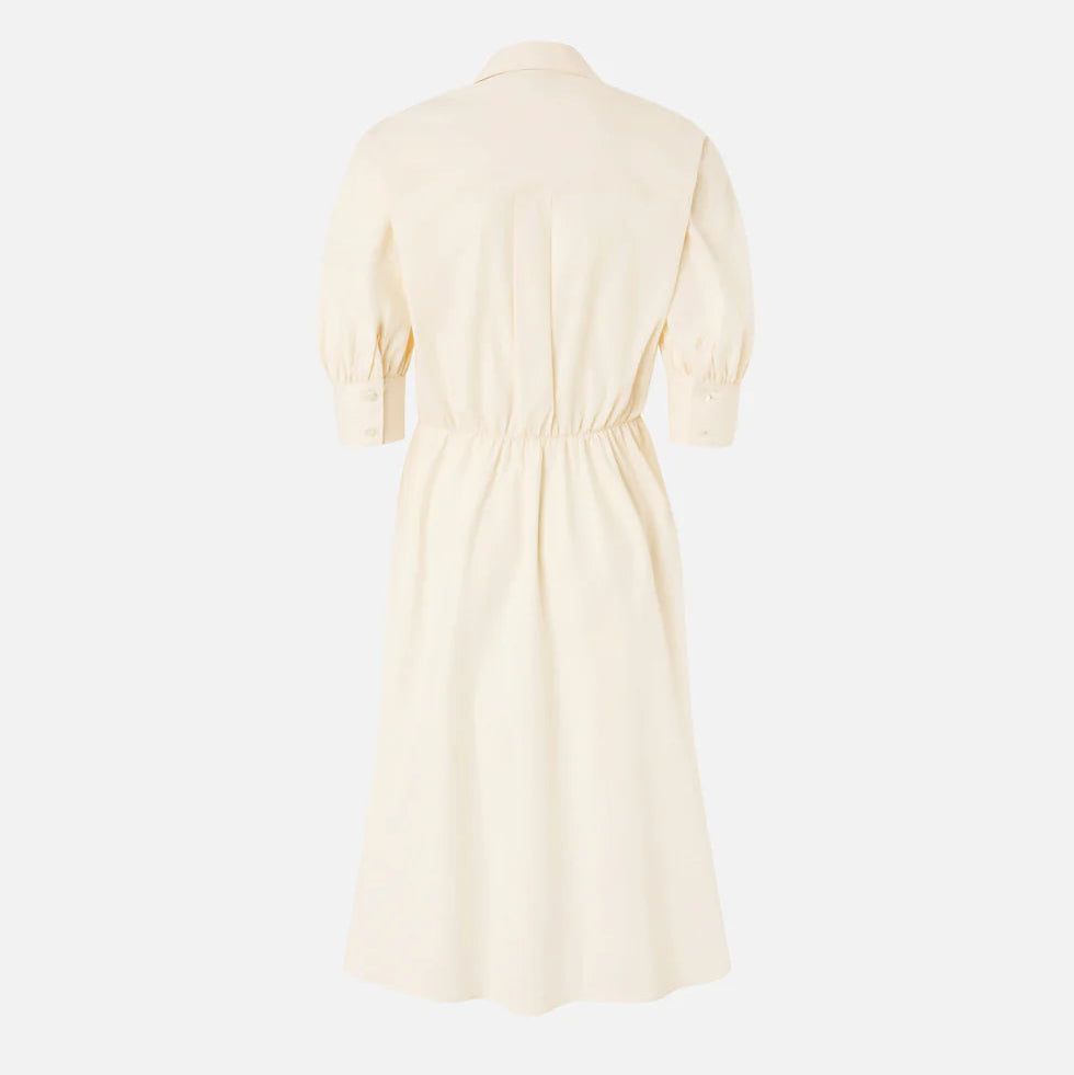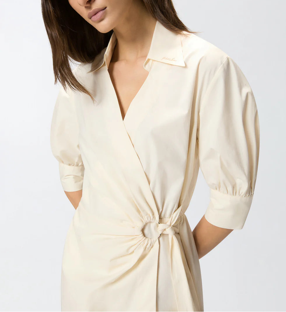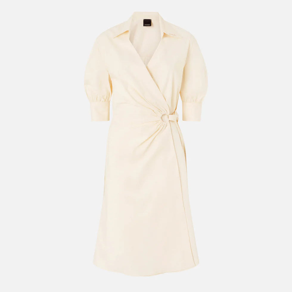 Vestido 97% algodão 3% elastano | Vestido midi com corpete apresentando mangas curtas bufantes com botões nas extremidades e gola de camisa com abertura em V e logotipo PINKO bordado em itálico. Esta peça é confecionada em popeline de algodão confortável, com toque macio e estruturado, e se destaca pelo design transpassado, fechado lateralmente com uma fita delicada que passa por um detalhe em argola. Com elástico na cintura e franzido na parte de trás, além de um elegante cós duplo plissado, este vestido é incomparável em sua versatilidade, perfeito para diversas ocasiões, de dia ou de noite.