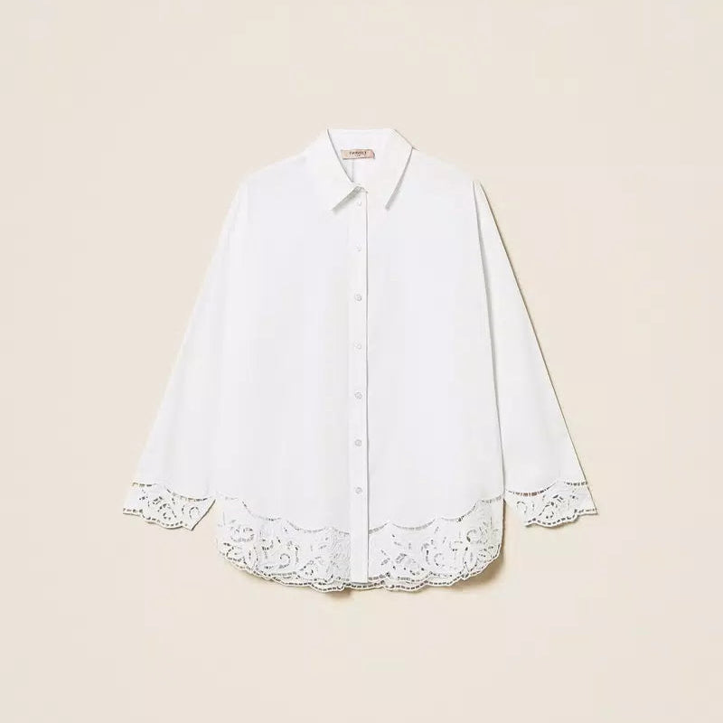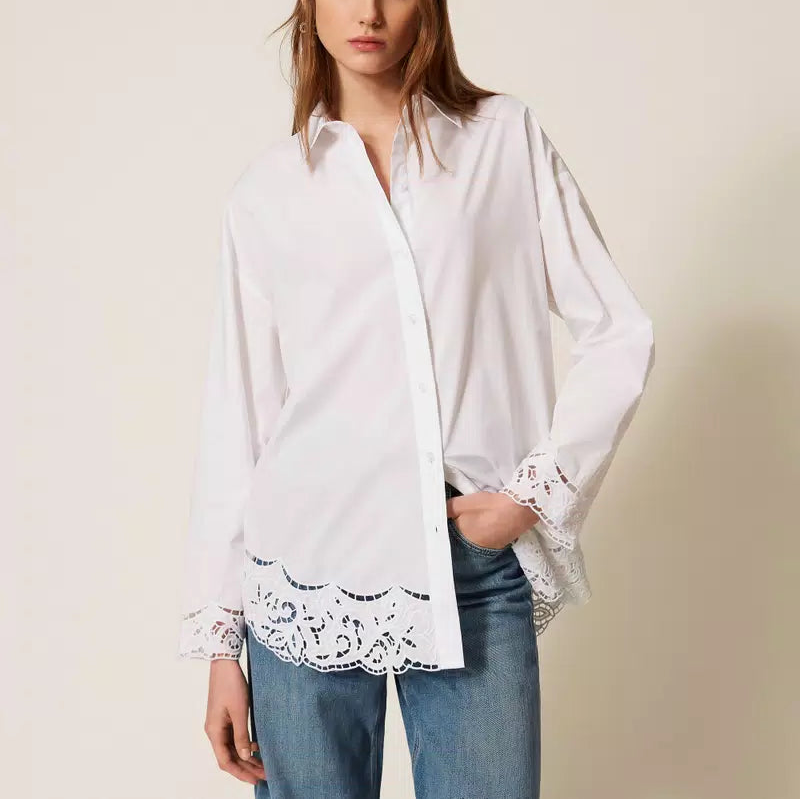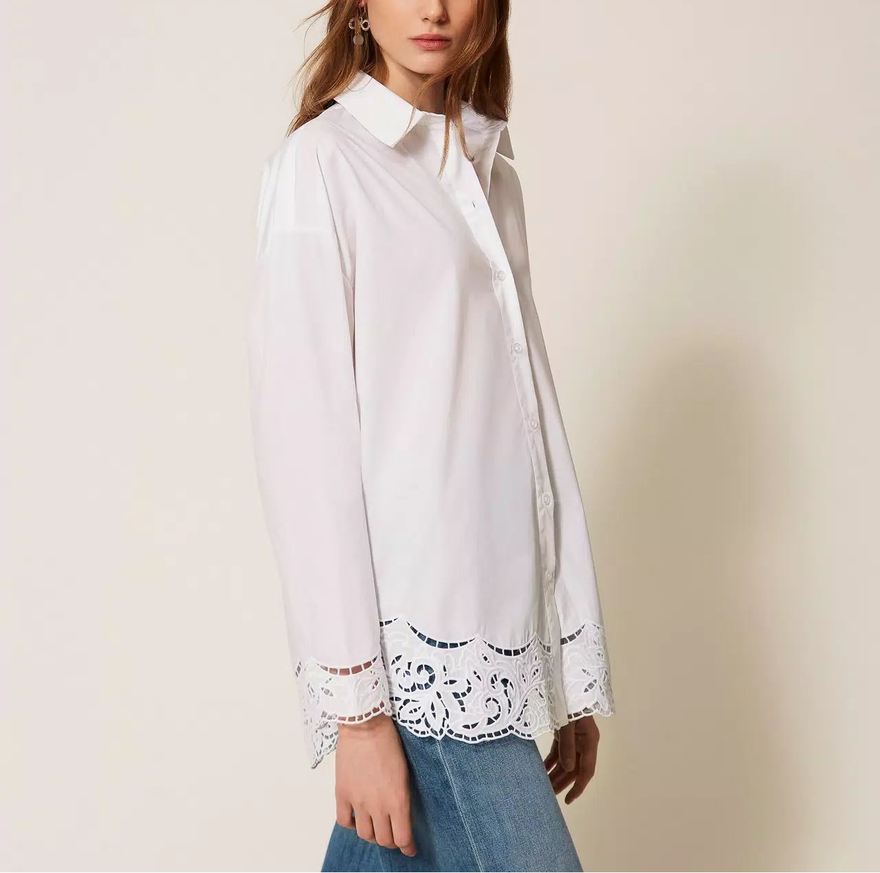 Camisa 100% algodão | Camisa de popeline de algodão com bordado embutido na barra e nos punhos. Fecho com botões, mangas compridas com punho e botão, modelagem ampla.