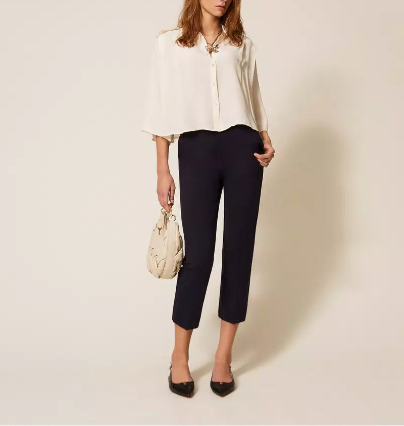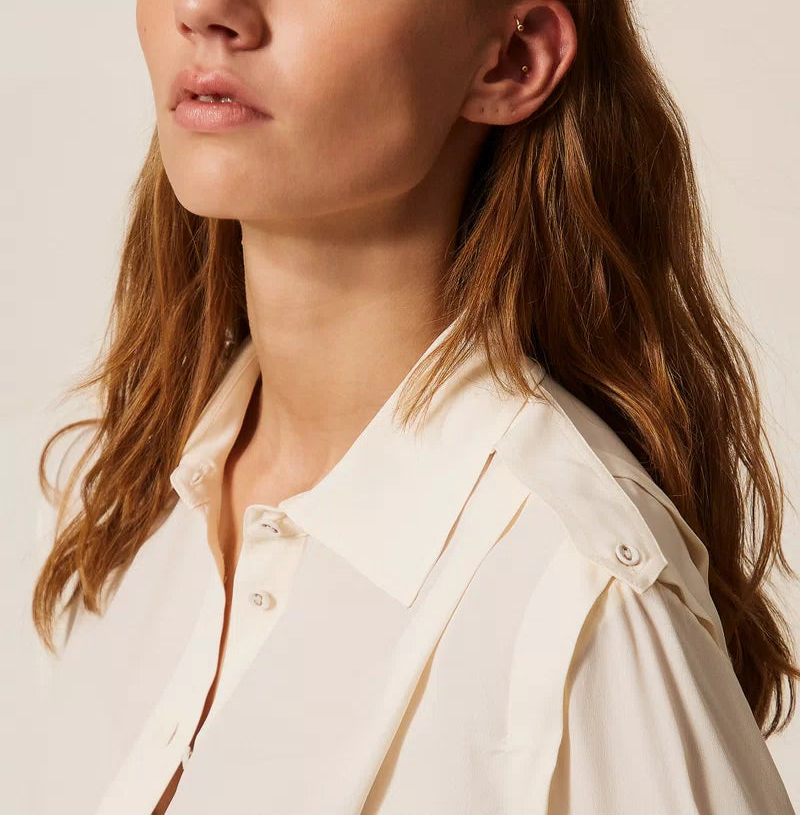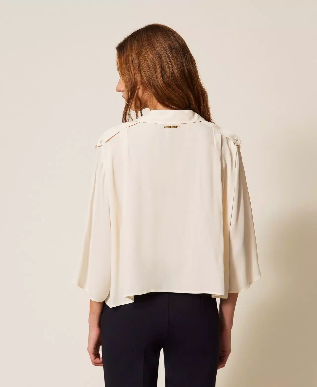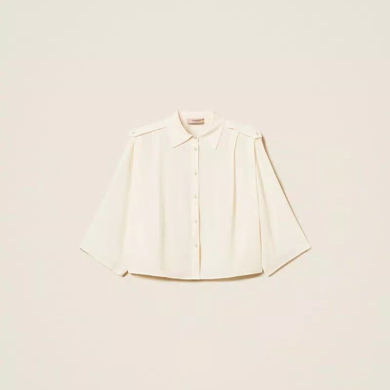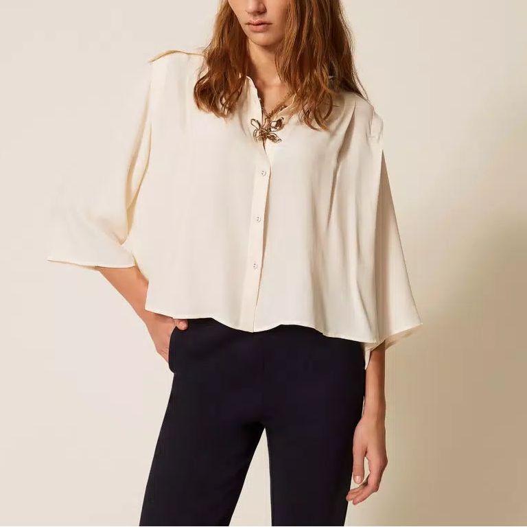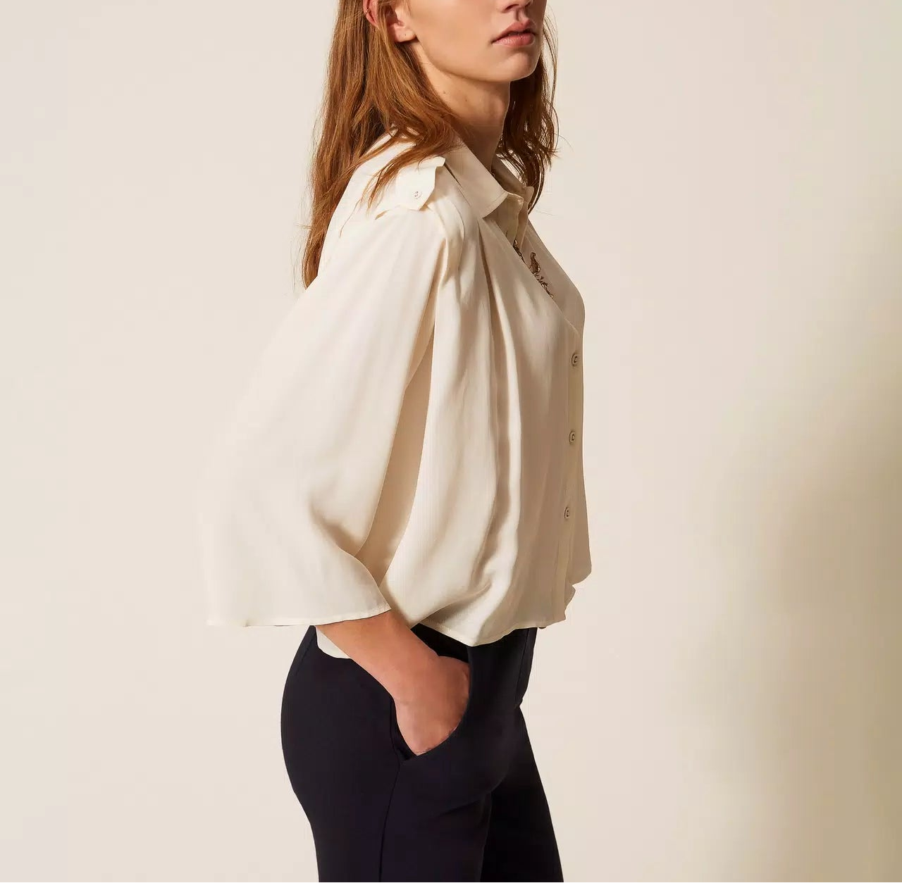 Blusa 67% acetato 33% viscose | Camisa cropped em crepe de chine com mistura de viscose, fecho de velcro e pregas nos ombros. Fecho com botões, mangas três-quartos amplas, modelagem solta.